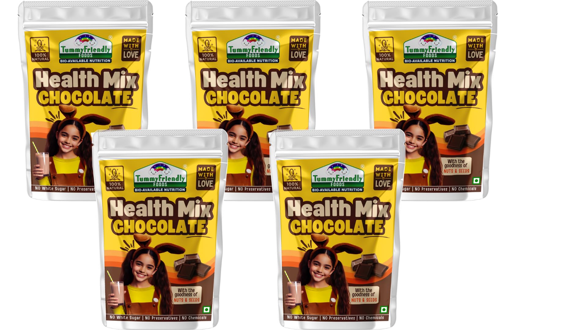TummyFriendly Foods Organic Chocolate Health Mix For Kids - 500g (100g each pack). Introducing our Organic Multi Grain Health Mix Powder - the ultimate health drink for kids! Crafted with care and packed with goodness this nutritious blend is specially formulated to provide essential nutrients for growing children. Say goodbye to sugar worries! Our health drink for kids without sugar offers a healthy option for parents seeking wholesome alternatives. Made with natural ingredients it's a deliciously healthy choice that kids will love. Created with the well-being of children in mind our health mix for kids is homemade with love. We understand the importance of nourishing your little ones with the best which is why our blend is free from artificial additives and preservatives. Suitable for ages 2-6 years our health mix for kids malt is designed to support their growth and development. With a rich combination of grains it's a powerhouse of nutrients that helps fuel their active lifestyles. Looking for a Healthy Milk Mix powder for kids? Look no further! Our Health mix for kids is the perfect solution. Packed with vitamins and minerals it's an easy and convenient way to ensure your child gets their daily dose of goodness. Make the switch to our Organic Multi Grain Health Mix Powder today and give your kids the gift of health and vitality. With every sip they'll be nourished energized and ready to take on the world!