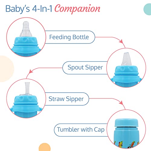 LuvLap 4 in 1 Slim Neck Steel Baby Bottle Cum Sipper with Handle, Made of SS304 Rust Free Steel, BPA Free, Odour Free, Anti Colic Nipple, Spout, Weighted Straw & Cap, Blue, 3M+, 240 ml