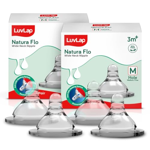 LuvLap Anti-Colic Natura Flo Teat/Nipple for Wide Neck Bottle,2Pcs Medium Flow, 3M+, Made of Soft & Flexible Silicone, Mimics Breastfeeding, Leak Proof, Bpa Free, Comes with Sturdy Base