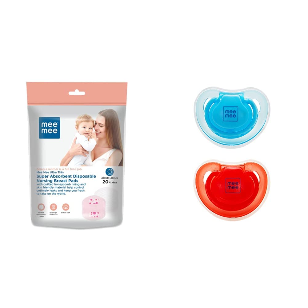 Mee Mee Ultra Thin Honeycomb Super Absorbent Disposable Nursing/Maternity | Breast Feeding/Breast Pads (48 Pads)| New Resealable Pack | Discreet FitMee Mee's Ultra Thin Super Absorbent Disposable Nursing Pads you can stay fresh and comfortably clean. The pad has a contoured shape with multiple layers that have unique moisture channels. The silky soft top-sheet has a one-way flow barrier that traps the leaks leaving your skin dry and clean.Mee Mee Soft Nipple Baby Pacifier (Red/Blue) (MM-3750 B)Pacifiers give babies oral stimulation soothe them in between feeds and also reduce discomfort they experience during the teething phase. Mee Mee's Pacifier is especially useful for preventing tongue thrush and also acts as a supportive aid in developing your baby's shape of jaw and palate.