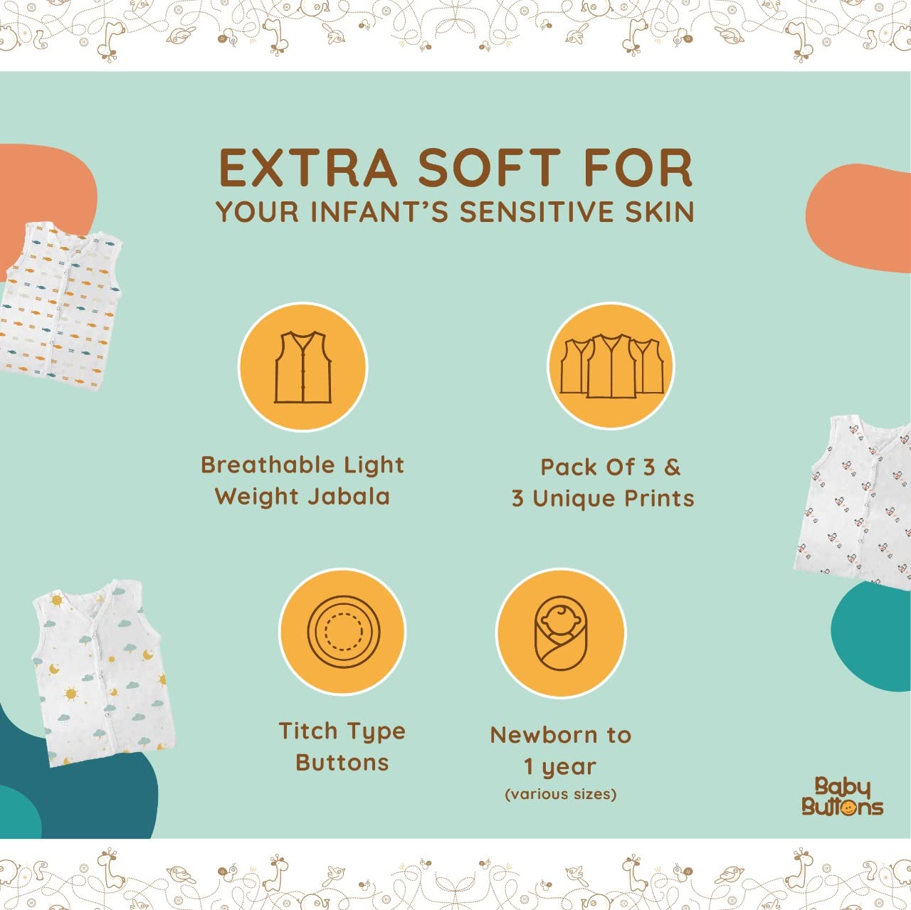 EXTRA SOFT FOR YOUR 'S SENSITIVE SKIN: The BabyButtons sleeveless printed jabla is the perfect solution for with extra sensitive and delicate skin since they are made of 100% breathable cotton.