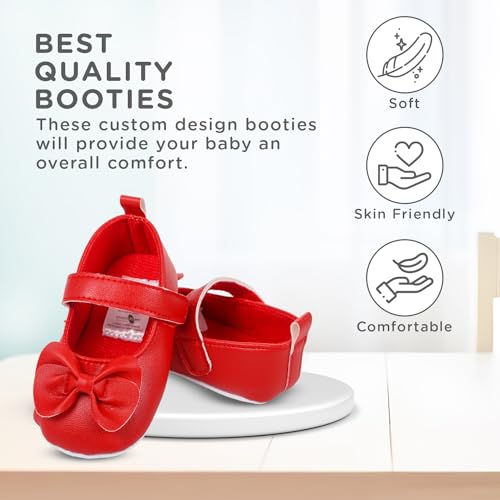 Quality Material (Soft and Breathable): Crafted with premium materials these baby booties provide a soft and breathable haven for your little one's tiny feet. Playful Touch: Infused with a playful touch our baby booties add a delightful charm to your baby's adorable ensemble. Lightweight: Designed to be feather-light these booties ensure that your baby can move with ease and comfort. Easy to Put On and Take Off: With a user-friendly design these booties make dressing up your baby a breezeâeasy to put on and effortless to take off. Anti-Slip Design: Enhanced with an anti-slip feature these booties provide stability and security for your little one's early steps.