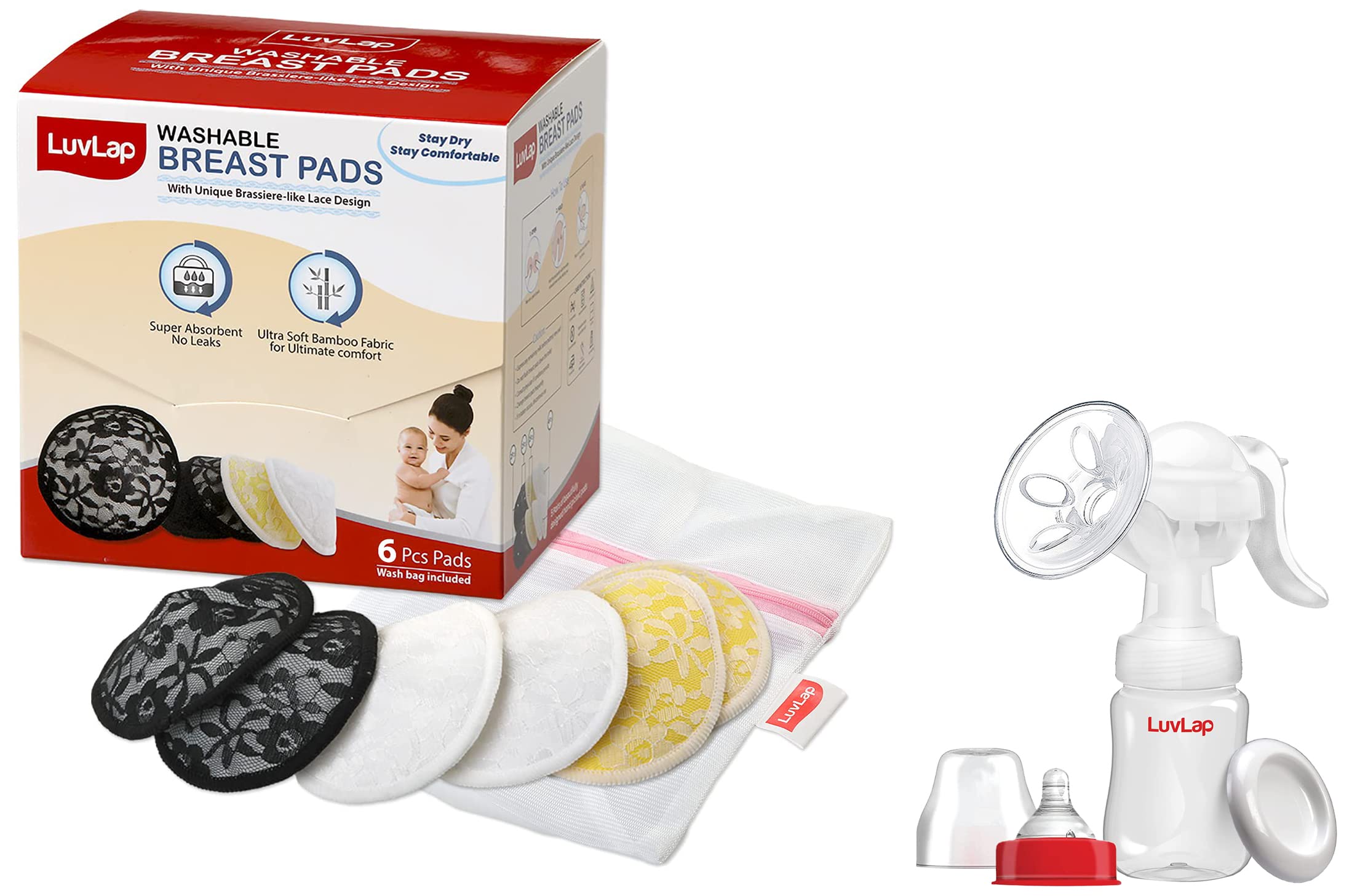 LuvLap Manual Breast Pump 3 Level Suction Adjustment 2pcs Breast pads free Soft & Gentle BPA FreeSoft cushions soft silicon cushions helps in expressing milk comfortably. Ergonomic shape for better grip and easy pumping with one hand. Comfort soft silicon cushions helps in expressing milk comfortably. 100% Sterilisable - all parts can be sterilized. Easy assembly and cleaning - intuitive design for easy assembly and cleaning. Extra container - extra container for pumping and milk storage. The package includes One Pump Unit One Milk Container Nipple Bottle Neck Part and Cap & Two Breastpads FreeLuvLap Natural Bamboo Washable Nursing Breast Pads for Breast feeding mothers Beautiful Lace Style Contoured Shape for snug fit Nipple Pad Includes Laundry Bag Super absorption 6PcLuvLap Washable breast pads quickly absorb excessive breast milk and lock in moisture for optimum dryness and comfort.