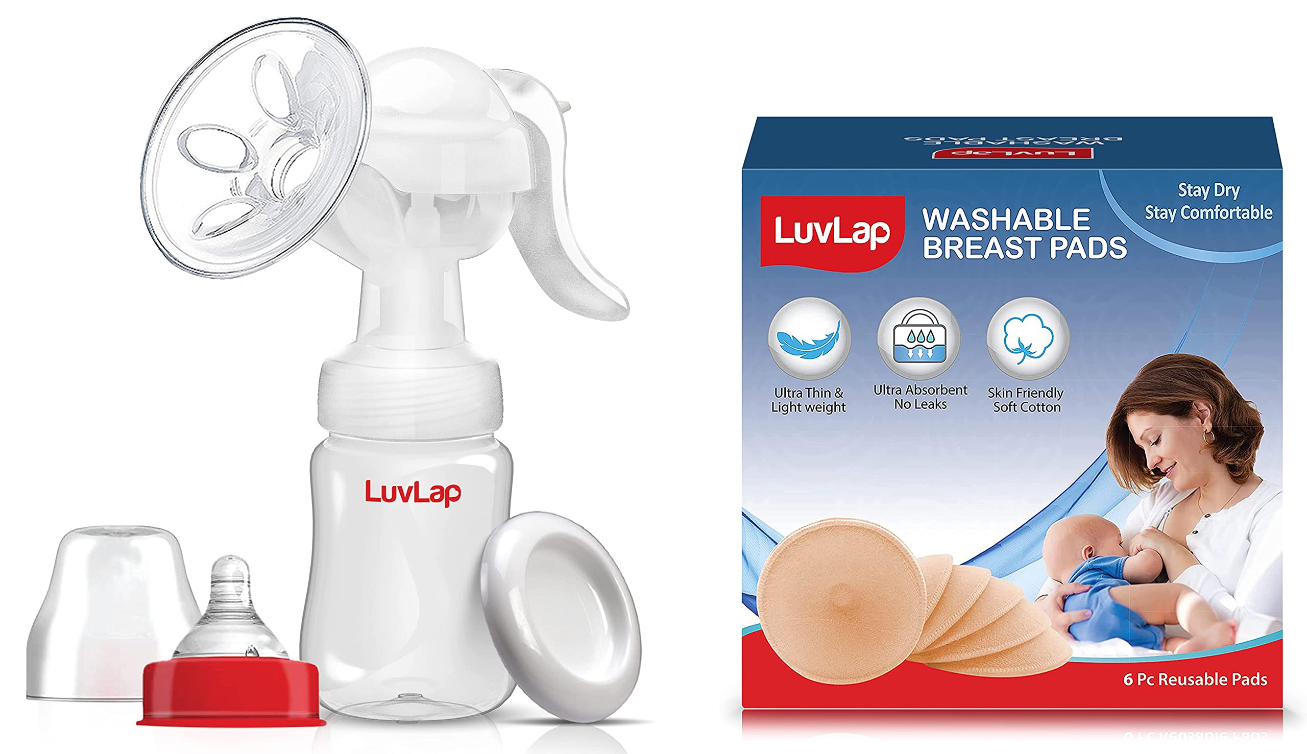 LuvLap Manual Breast Pump 3 Level Suction Adjustment Soft & Gentle BPA FreeSoft cushions soft silicon cushions helps in expressing milk comfortably. Ergonomic shape for better grip and easy pumping with one hand. Comfort soft silicon cushions helps in expressing milk comfortably. 100% Sterilisable - all parts can be sterilized. Easy assembly and cleaning - intuitive design for easy assembly and cleaning. Extra container - extra container for pumping and milk storage.LuvLap Washable Breast Pads Pack of 6LuvLap washable breast pads are super absorbant reusable pads that help prevent untimely leaks and keeps you dry and comfortable.