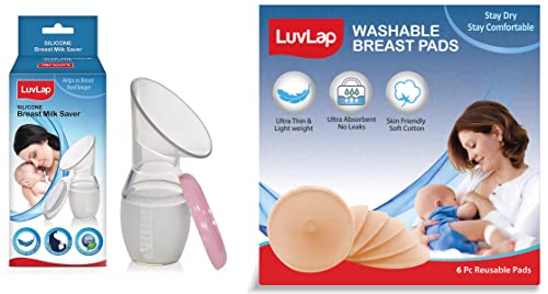 Luvlap Silicone Food Grade Breast Milk Catcher/Saver(White 100ml)Compact and easy-to-use breast pump helps you collect all the milk from one breast while your baby is nursing on the other. Use it to collect excess milk flow as well as to express milk for later use.LuvLap Washable Maternity Nursing Breast Pads 6 Pcs Reusable Leak-proofLuvLap washable breast pads are super absorbant reusable pads that help prevent untimely leaks and keeps you dry and comfortable.