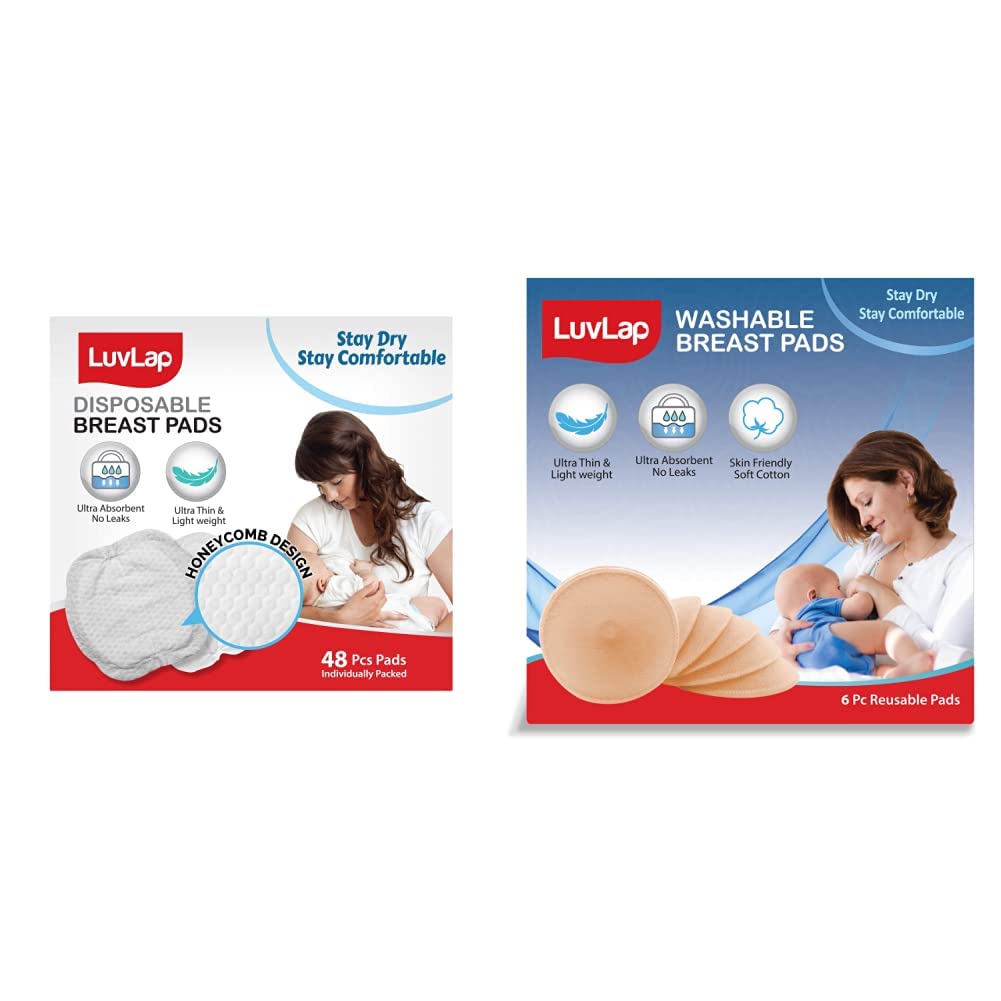 LuvLap Ultra Thin Honeycomb Nursing Breast Pads 48pcs Disposable High Absorbent Discreet FitLuvlap breast pads 48's pack super absorbent pad quickly absorbs excessive breast milk and locks in moisture for optimum dryness and comfort.LuvLap Washable Maternity Nursing Breast Pads 6 Pcs Reusable Leak-ProofLuvLap washable breast pads are super absorbant reusable pads that help prevent untimely leaks and keeps you dry and comfortable.