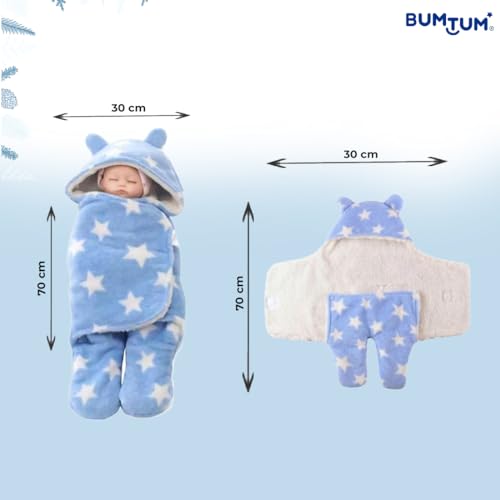 Bumtum 3-in-1 Hooded Baby Soft Blanket Wrapper| Swaddle for New Born Babies(Boys & Girls) 0-6 Months, Travel-Friendly, Star Printed (Sky Blue)