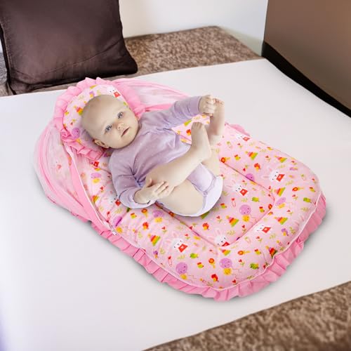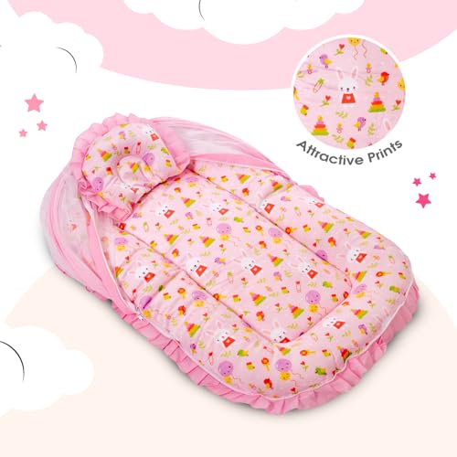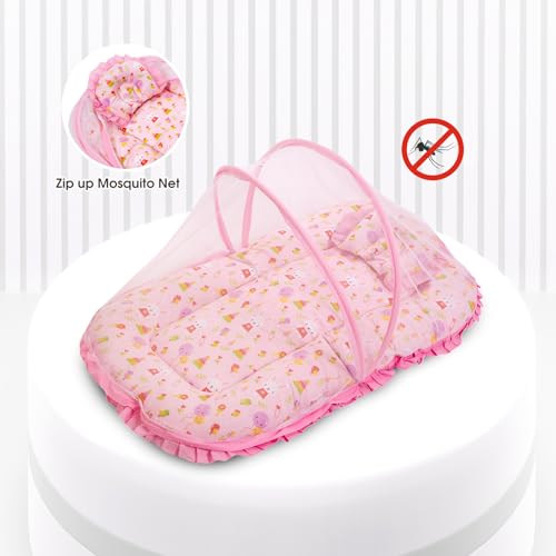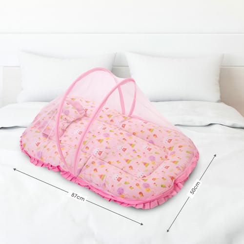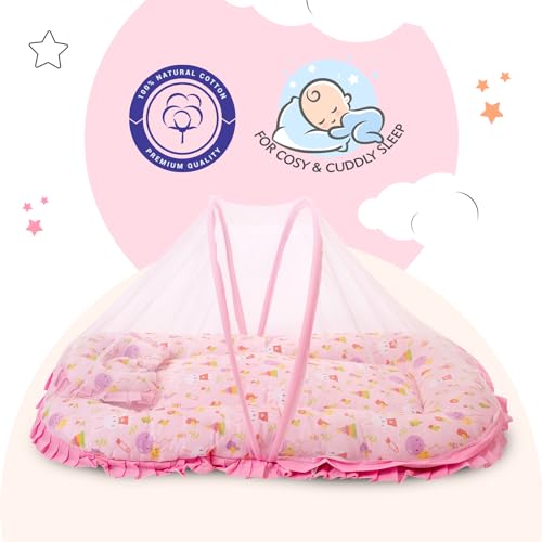 Mee Mee Cushioned Baby Mattress Set with Mosquito Net & Pillow in a delightful colors this set is designed to provide unparalleled comfort and protection for your baby. The mattress made from premium-quality breathable fabric ensures a gentle and soothing sleep with plush cushioning that supports your baby's delicate body. The integrated mosquito net crafted from fine durable mesh offers a secure barrier against insects ensuring undisturbed rest. Included in the set is a matching pillow filled with hypoallergenic materials providing gentle head and neck support. Easy to clean and maintain this portable and practical mattress set is perfect for both home and travel offering a cozy and safe sleeping environment for your baby.