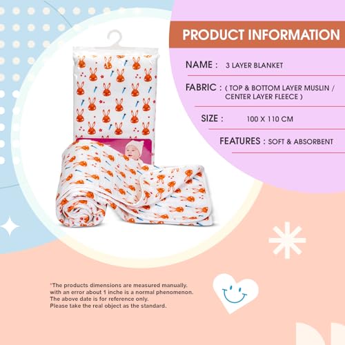 3 Layer Blanket: Top & Bottom Layer made up of Muslin & Center Layer made up of Fleece. Luxuriously Soft Material: Crafted from ultra-soft plush fabric to provide your baby with the ultimate comfort and warmth. Versatile Usage: Perfect for swaddling cuddling or using as a stroller or car seat blanket ensuring your baby stays cozy wherever you go. Generous Size: With its ample dimensions this blanket provides ample coverage for your growing infant or toddler. Easy Care: Machine washable and durable making it a breeze to keep clean and maintain its softness over time. Stylish: The charming color adds a touch of elegance to your baby's essentials. Thoughtful Gift: Makes for an ideal baby shower or newborn gift sure to be appreciated by new parents.