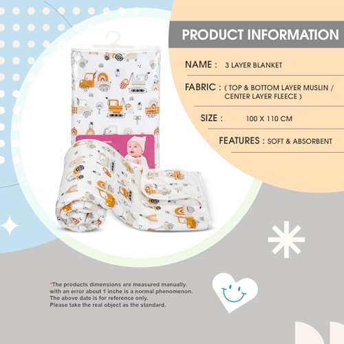 3 Layer Blanket: Top & Bottom Layer made up of Muslin & Center Layer made up of Fleece. Luxuriously Soft Material: Crafted from ultra-soft plush fabric to provide your baby with the ultimate comfort and warmth. Versatile Usage: Perfect for swaddling cuddling or using as a stroller or car seat blanket ensuring your baby stays cozy wherever you go. Generous Size: With its ample dimensions this blanket provides ample coverage for your growing infant or toddler. Easy Care: Machine washable and durable making it a breeze to keep clean and maintain its softness over time. Stylish: The charming colour adds a touch of elegance to your baby's essentials. Thoughtful Gift: Makes for an ideal baby shower or newborn gift sure to be appreciated by new parents.
