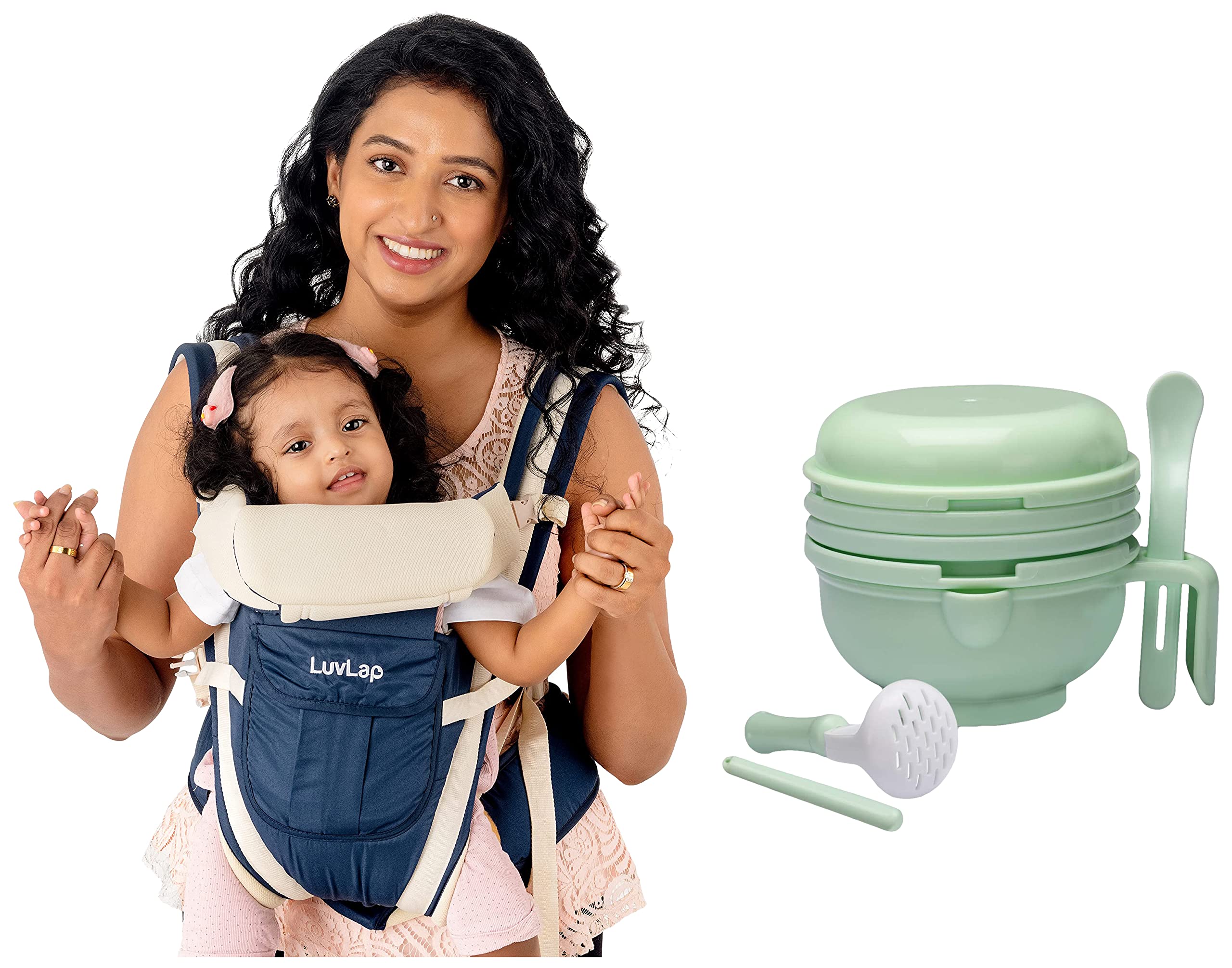 LuvLap Elegant Baby Carrier with 4 Carry Positions for 4 to 24 Months Baby Max Weight Up to 15 Kgs (Dark Blue)Lifes little stories bloom with coming of the little one in your life. It completes your life with many joys of parenthood. At LuvLap we endeavor to weave the little stories into our products with an emphasis on child safety and enrichment of features. Meticulously designed our range of strollers prams car seats buggies and other outdoor gear lets your baby discover the world from the lap of luxury. They are comfortable nests that accompany your baby on tours through the city streets and country roads. Ergonomically designed to ensure your baby is always comfortably supported. So that your little one gets the comfort thats next only to the warmth of your lap. Conceived with care and made using the latest marvels of science all LuvLap products undergo multiple quality checks before they are dispatched to the stores. The products are available at all leading baby gear and online stores and conform to the European standards.LuvLap 9 in 1 Baby Food Masher Mill Food Grinder Cum Processor with Multifunction Textured Mashing & Filtering Plates with Serving Bowl (Light Green)LuvLap 9 in 1 Baby Food Processor is Made of BOA Free PP material. It is nontoxic odor free and tasteless. It's different types of grinding modes include juicing filtering crushing and holding food. It could be used to grind fruits & vegetables meat and fishes into smooth paste. Different grinding filter has different use thegrinding filter with a lot of triangle bulges is for making blanketcarrot or cucumber the filter covered with small holes is used formaking fruit juice.It is easy to clean. Just rinse it with running water & let it dry