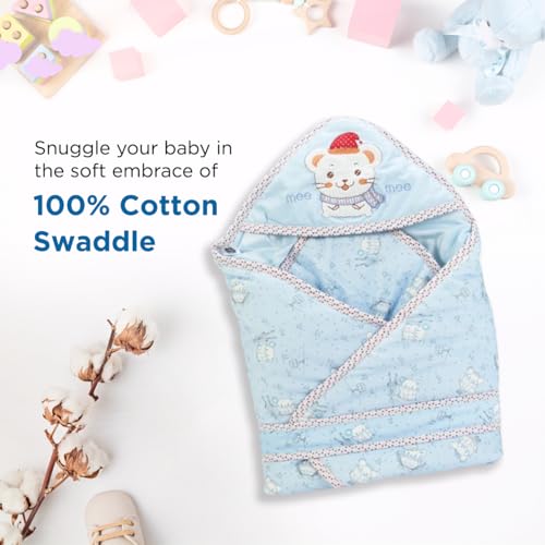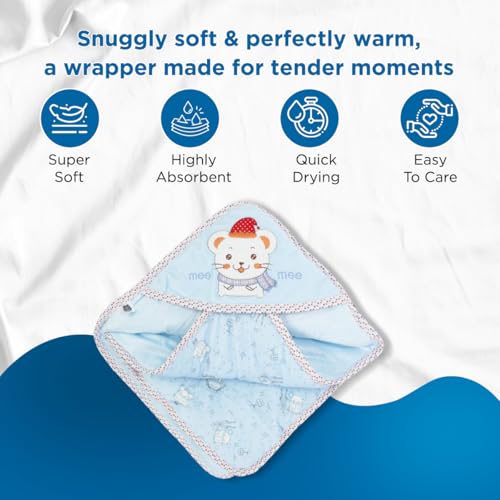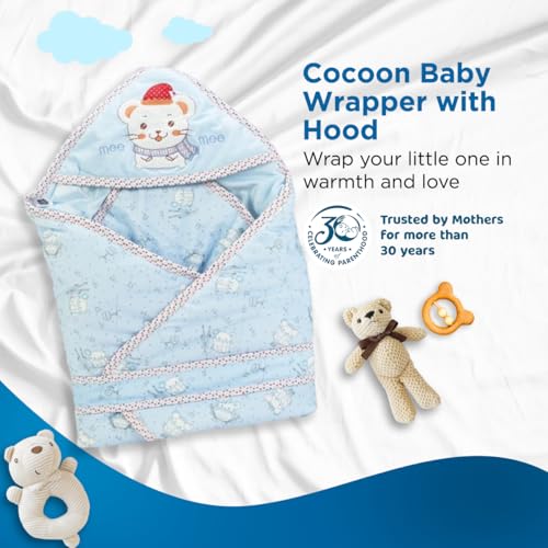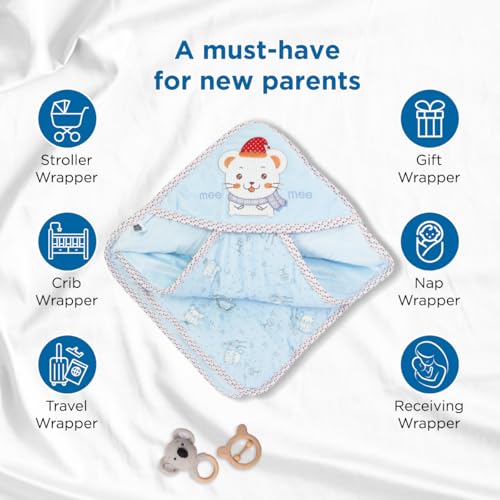 HomeBabyNurseryBaby SafetyMee Mee 100% Soft Cotton Hooded Baby Wrapper Cum Warmer, Blanket with Hood for New Born Baby 0 to 6 Months (Blue-Teddy Print)