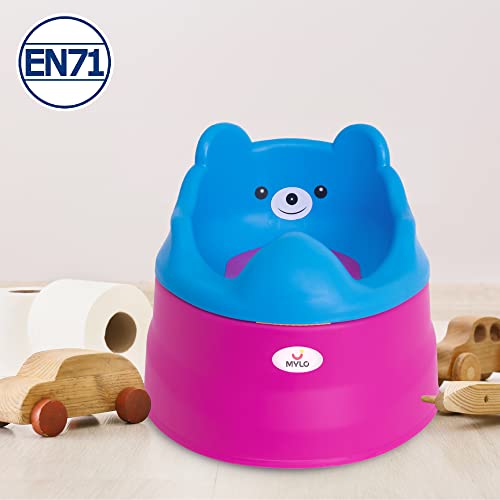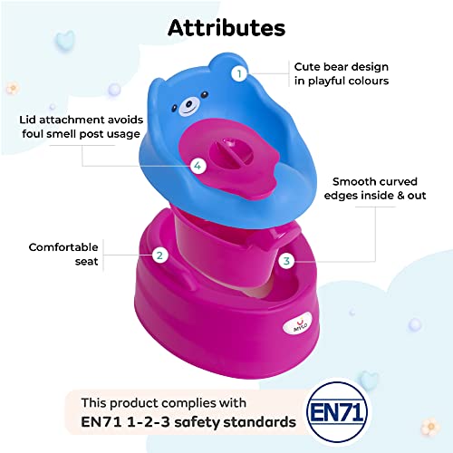 For a Cozy Convenient & a Cute Bath Time WHAT IT IS- Toilet training is a crucial phase that every parent dreads. For easy transition from diapers to a toilet seat we present Mylo Essentials 2-in-1 Potty Training Seat for 6 Months+ Child with Detachable Potty Bowl and Adaptable Potty Seat. The potty training seat is specially designed with comfortable high back support to give comfort to your child and prevent from falling back. The 2-in-1 Bear Potty seat clamps with most western toilets available in the market and provides better and easy potty training to your baby. The kids toilet seat for western toilet complies with EN71 1-2-3 standards and is made of plastic. The bear design makes kids potty seat look more playful cute and attractive. This toilet seat for kids is lightweight making it easy to carry. The attachment bowl makes it easy to wash and clean. Smooth curved edges inside and out make it harmless for the baby to sit. It comes with a lid attachment to avoid foul smell after usage. With this potty chair for baby in playful colours your child will surely enjoy the transition and you too will have a hassle-free potty-training time. HOW IS OUR PRODUCT DIFFERENT? Mylo Essentials 2-in-1 Potty Training Seat is ideal for babies & toddlers as it is fabricated out of non-toxic plastic material. This potty-training seat has soft curved edges making it harmless for your child to use. It is easy to wash and clean as it comes with an attachment bowl. The USP of our potty-training seat is that it comes with a lid which avoids foul smell after usage and also keeps the surroundings germ & infection-free. The design & color makes it look attractive and playful. Mylo ensures rigorous quality testing to provide the best of products to you.
