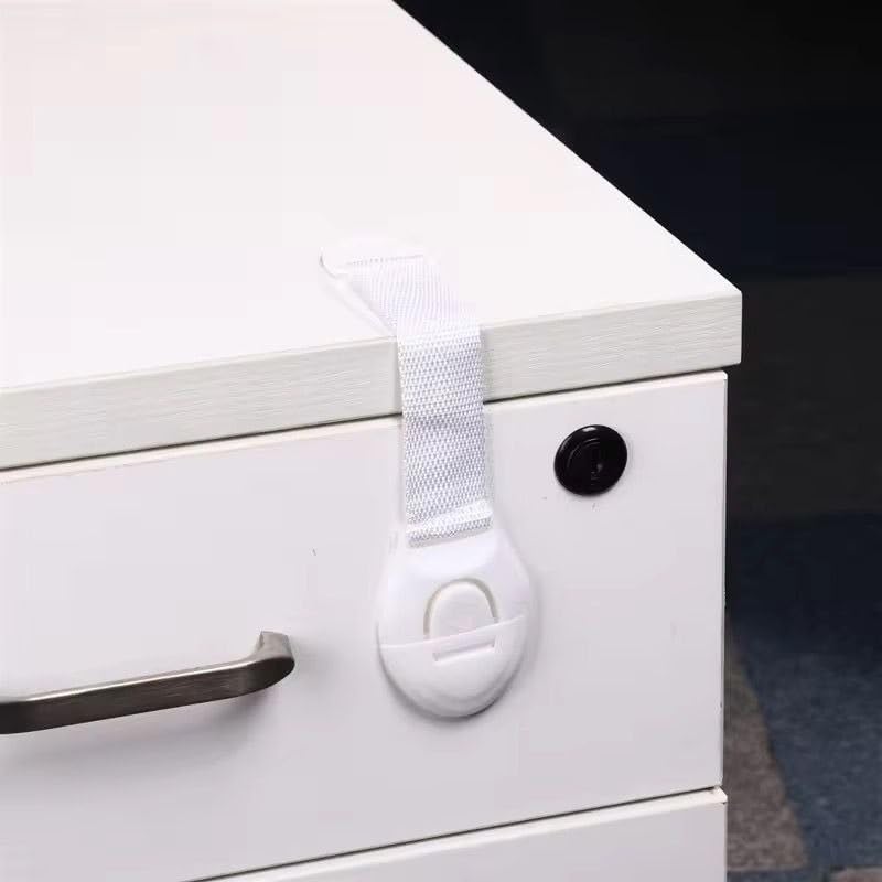 Most parents eagerly anticipate the day when their child begins to crawl but soon learn that their child's newfound mobility can expose him/her to a world of dangers. Children love to explore and a closed cabinet door will peak their natural curiosity. In most households cabinets and drawers contain cleaning products insecticides medications and other products that could be harmful to your baby if ingested or inhaled. In addition to these harmful products cabinets themselves pose a threat to your child. They can slam shut or pinch your child's fingers. That's why it's important to baby proof your home before your child becomes mobile. This safety lock is just the very useful product to secure your cabinets from your baby's curious fingers. It has adhesive pads to stick to all even surfaces easy to install first open the safety lock and peel off the backing from the adhesive pad then affix the pads on the cabinet door respectively; when you need to open the cabinet just press the band then you will open the door as you want quick and easy to open. The one hand release operation is easy for an adult hand but difficult for a child ideal for keeping cabinets drawers cupboard and appliance doors closed. Note: though this product is highly effective it is not a substitute for closely supervising your child. Even the most effective lock can fail to keep a curious and determined child out of a cabinet. In addition to installing cabinet locks parents should also take other precautions to ensure their child's safety such as storing potentially harmful products in cabinets that will be out of your child's reach and never leaving your child unattended in an environment where their curiosity can lead them into a dangerous situation.