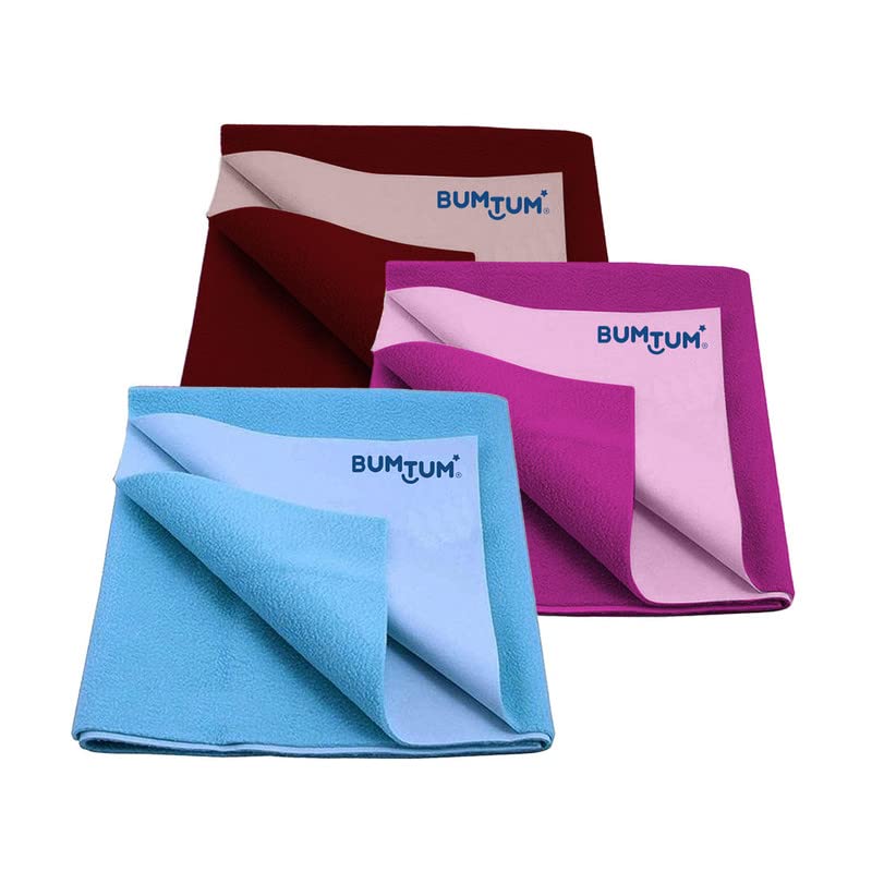 Bumtum Baby Dry Sheet Waterproof Quick Soft Fleece Baby Bed Protector | Anti - Bacterial, Extra Absorbant, Reuseable & Washable (Maroon + Grape + Aqua Blue Combo, Small Size, 50 * 70cm, Pack of 3)