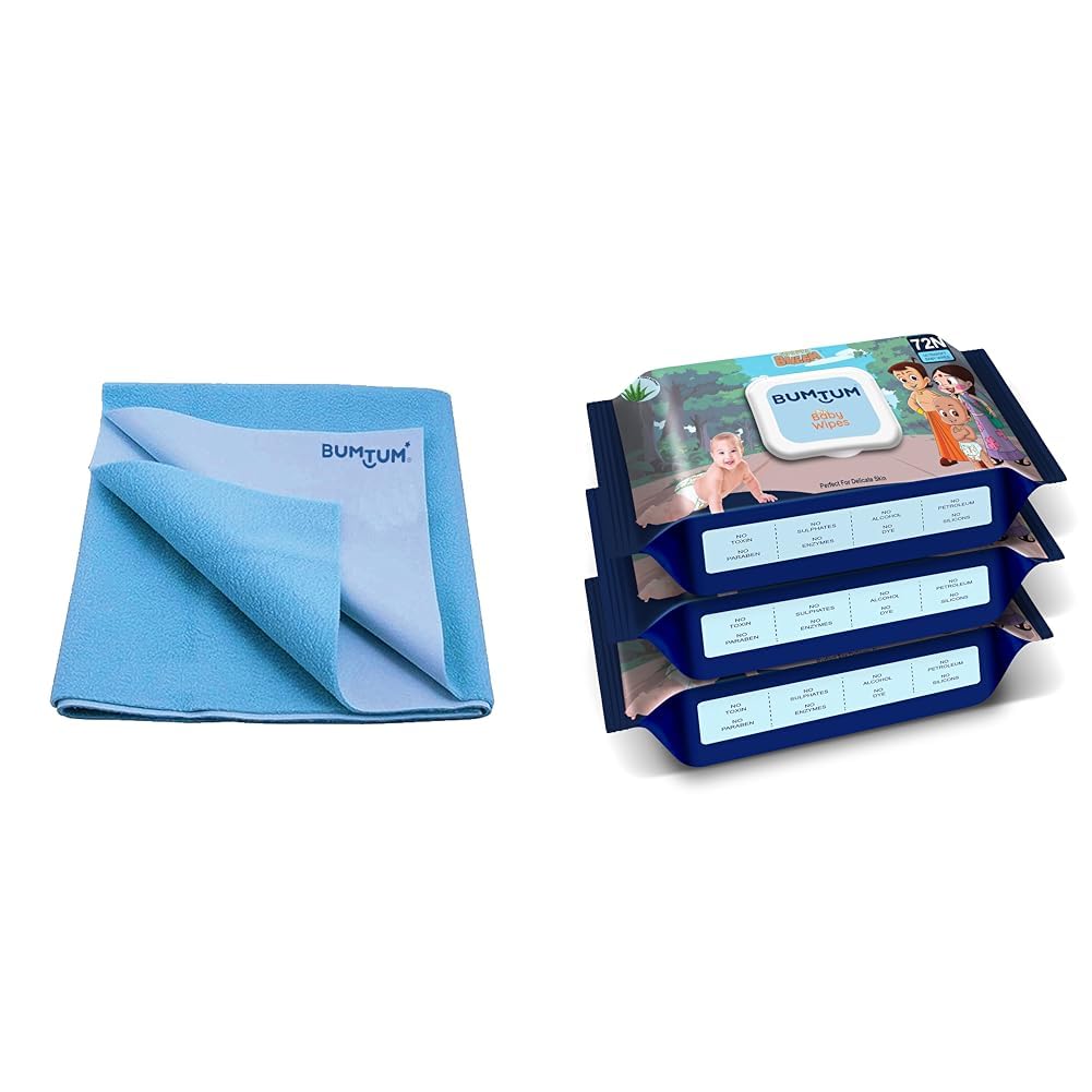Bumtum Baby Dry Sheet Waterproof Soft Fleece Baby Bed Protector | Anti - Bacterial & Odour Free | Extra Absorbant Reuseable & Washable (Aqua Blue Large Size 100 * 140cm Pack of 1)BumTum Baby dry sheets are comfortable and durable made from super soft breathable quality. These are water resistant sheets that protect mattresses and surfaces from liquid spills and bedwettingBumtum Baby Chota Bheem Gentle Soft Moisturizing Wet Wipes With Lid | 20 X 14Cm Aloe Vera & Chamomile Extracts | Paraben & Sulfate Free (Pack of 3 72 Pcs. Per Pack)Bumtum Baby Wet Wipes are soft and natural with no harsh chemicals and as mild to skin as pure water. Ideal for cleansing face hands feet bums and tums. These wipes are soft and enriched with aloevera chamomile extract Vitamin E & Castor oil which protect against rashes and nourishes the skin.