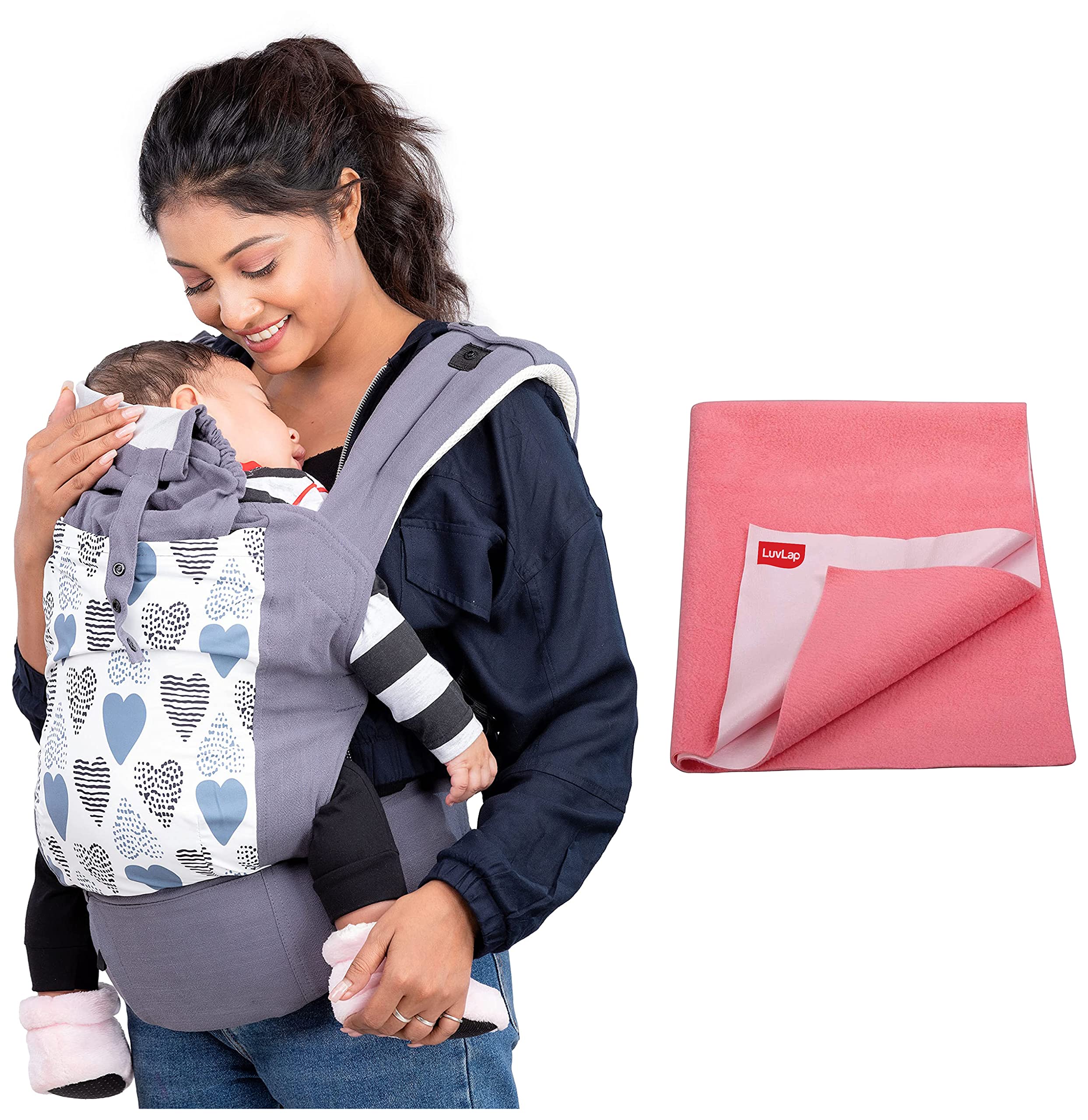 Luvlap Adore Baby Carrier with 3 carry positions for 6 to 24 months baby Max weight Up to 18 Kgs (Grey)Now take your baby outdoors without any hassle or worries in this convenient LuvLap Adore baby carrier. It is great for your baby to explore safely with you while feeling emotionally secure. Made of premium quality breathable fabric with multiple carrying positions and adjustable belts it ensures comfort for both baby and parent. Close carrying has been scientifically proven to help your baby grow up to be secure intelligent family oriented and happy. So whether it is to do small chores or to meet friends you can take your baby out with you every time.LuvLap Instadry Anti-Piling Fleece Extra Absorbent Quick Dry Sheet for baby Baby Bed Protector Waterproof baby sheet Small size 100x140cm Pack of 1 Salmon RoseLuvLap instadry extra absorbent sheet come with soft and breathable material lightweight and easy to carry.