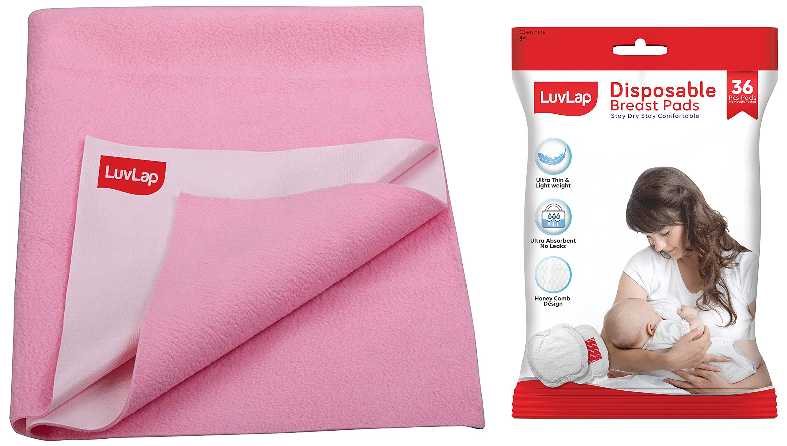 LuvLap Ultra Thin Disposable Breast Pads Super Absorbent Discreet Fit Pack of 36 (White)LuvLap breast pads 36's pack super absorbent pad quickly absorbs excessive breast milk and locks in moisture for optimum dryness and comfortLuvLap Instadry Anti-Piling Fleece Extra Absorbent Quick Dry Sheet for baby Baby Bed Protector Waterproof baby sheet Small size 50x70cm Pack of 1 Baby PinkLuvLap instadry extra absorbent sheet come with soft and breathable material lightweight and easy to carry.