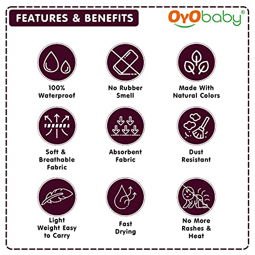 OYO BABY waterproof undermats will provide excellent protection against fluids urine perspiration allergens dust mites and bacteria. It is 100 percent waterproof yet breathable comfortable and noiseless. The mat is vinyl (PVC) free and safe to sensitive skins. OYO BABY mattress undermat is covered by high quality cotton fibre and high absorbent bamboo fibre liner which allow the mat to feel exceptionally smooth on the skin even after repeated uses and washes. Unlike traditional waterproof mats that use vinyl (PVC) as barrier OYO BABY undermats use a safer material called TPU. TPU is toxic free noise free and totally breathable. TPU also prevents microorganisms and molds as well as dust mites ideal for ultimate allergy relief. No matter you are at home or on-the-go and travel put it on a bed a chair a sofa or on your lap use it for your toddler elderly parents.