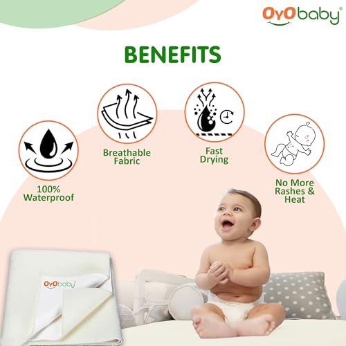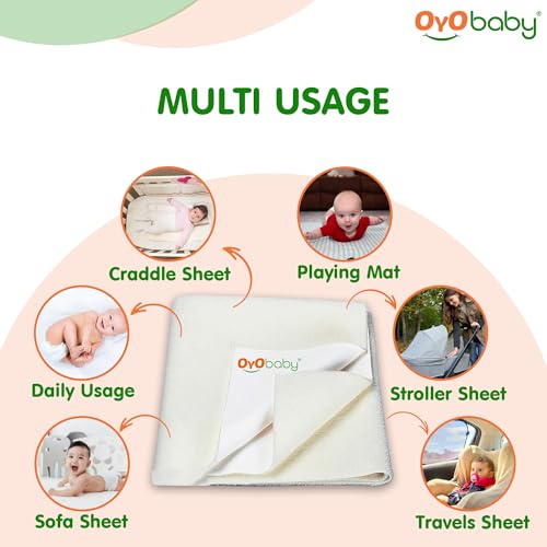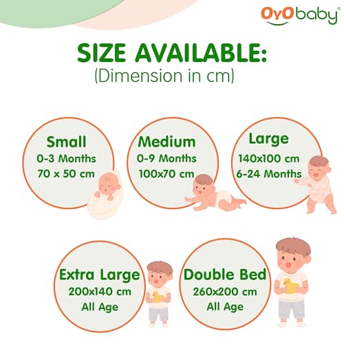 OYO BABY baby dry sheet is made of best waterproof material and highly absorbent fibre. Provides freedom to enjoy uninterrupted sleep for longer periods. It is with quick dry technology that dries faster. Feel the diaper free night and rush-free skin cosy smooth and silky feeling. This waterproof mattress protector has cosy soft and smooth top surface for baby to have sound sleep all night with maximum protection. OYO BABY quick dry bed protector sheet Moreover it is skin friendly and heat-free soft and unique multi-layer noiseless fabric sheet. It is an alternative to PVC rubber mats. Highly hygienic and breathable water proof sheet which is durable reusable economical and light weight. This amazing baby bed protector sheet is ready to use anywhere you go. This baby dry sheet is delicate spongy associated water-proof on these lines creating the tangle usable for babies and grown-up. Made up natural colour dyes which are best for babies. Further this perfect dry sheet for babies protects bed from obtaining wet. So offer your baby the liberty to pee on the bed and let them sleep for extended hours. This sheet from OYO BABY is an absorbent & water proof. It stops the piss or any liquid from getting in your mattresses. It dries quickly so you don't have to be compelled to amendment the sheets once more & again. Conjointly it holds eight times water then its weight. Also it is available in 4 different sizes - Small Medium Large & Extra Large. For example if you want dry sheet for baby for double bed then you dont have to worry we are having the best baby dry sheets here.