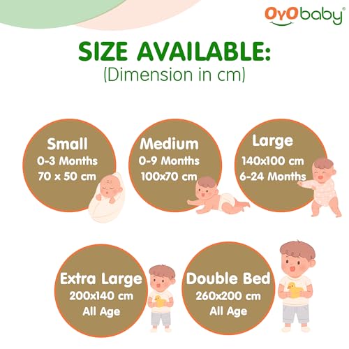 OYO BABY baby dry sheet is made of best waterproof material and highly absorbent fibre. Provides freedom to enjoy uninterrupted sleep for longer periods. It is with quick dry technology that dries faster. Feel the diaper free night and rush-free skin cosy smooth and silky feeling. This waterproof mattress protector has cosy soft and smooth top surface for baby to have sound sleep all night with maximum protection. OYO BABY quick dry bed protector sheet Moreover it is skin friendly and heat-free soft and unique multi-layer noiseless fabric sheet. It is an alternative to PVC rubber mats. Highly hygienic and breathable water proof sheet which is durable reusable economical and light weight. This amazing baby bed protector sheet is ready to use anywhere you go. This baby dry sheet is delicate spongy associated water-proof on these lines creating the tangle usable for babies and grown-up. Made up natural colour dyes which are best for babies. Further this perfect dry sheet for babies protects bed from obtaining wet. So offer your baby the liberty to pee on the bed and let them sleep for extended hours. This sheet from OYO BABY is an absorbent & water proof. It stops the piss or any liquid from getting in your mattresses. It dries quickly so you don't have to be compelled to amendment the sheets once more & again. Conjointly it holds eight times water then its weight. Also it is available in 4 different sizes - Small Medium Large & Extra Large. For example if you want dry sheet for baby for double bed then you dont have to worry we are having the best baby dry sheets here.