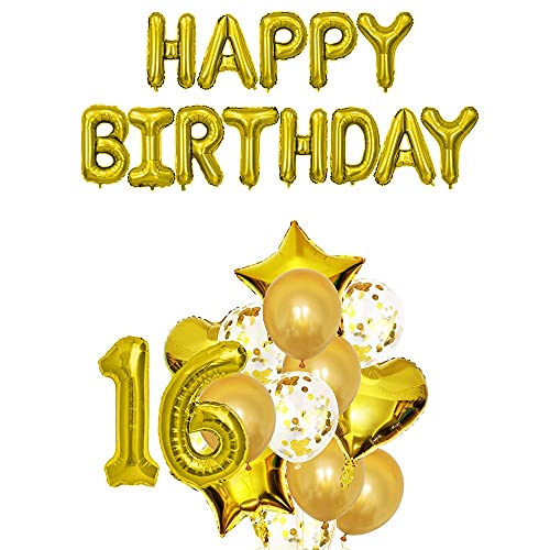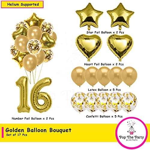 HomeBabyParty SuppliesPop The Party 16th Birthday Party Decorations Gold Supplies Big Set With Happy Birthday Balloons Banner and 16 Digit Balloon for Including Latex, star, heart and Confetti Balloons