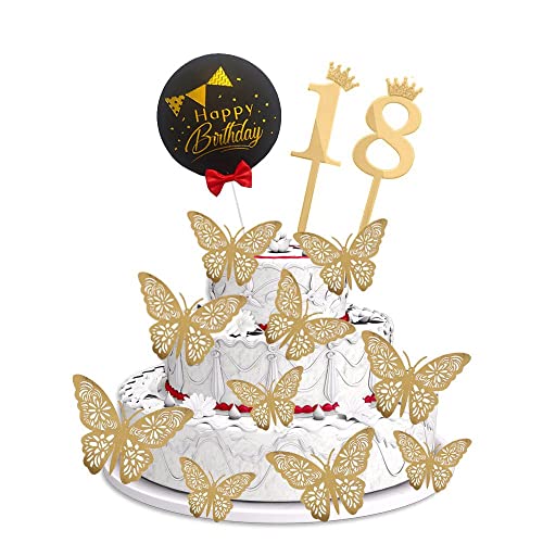 HomeBabyParty SuppliesPop The Party 18th Birthday Cake Decorations Gold Supplies Big Set with Black Happy Birthday Cake Topper, 12 Butterfly Cake Topper and 18 Digit Cake Topper
