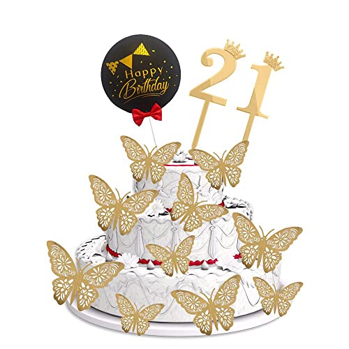 HomeBabyParty SuppliesPop The Party 21st Birthday Cake Decorations Gold Supplies Big Set with Black Happy Birthday Cake Topper, 12 Butterfly Cake Topper and 21 Digit Cake Topper