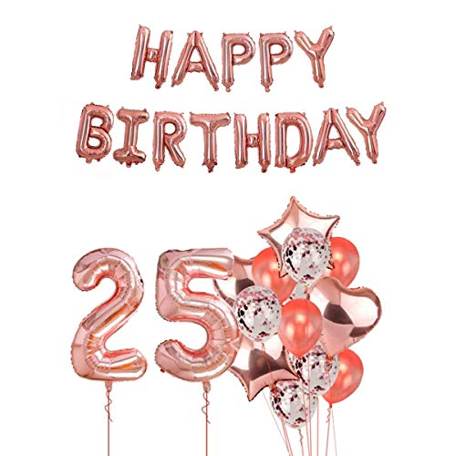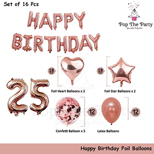 HomeBabyParty SuppliesPop The Party 25th Year Birthday Party Decorations Rose Gold Supplies Big Set with Happy Birthday Balloons Banner and 25 Digit Balloon for Including Latex, Star, Heart and Confetti Balloons