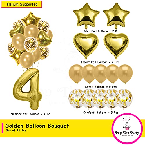HomeBabyParty SuppliesPop The Party 4th Birthday Party Decorations Gold Supplies Big Set With Happy Birthday Balloons Banner and 4 Digit Balloon for Including Latex, star, heart and Confetti Balloons