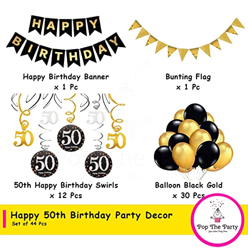 Pop The Party 50th Birthday Decoration Set with Happy Birthday Banner, Swirls, Triangle Bunting and Latex Balloon