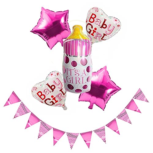 6 Pcs Its A Girl Bottle Set Pink Star Baby Girl Balloon And Bunting Flag For Baby Shower Decoration