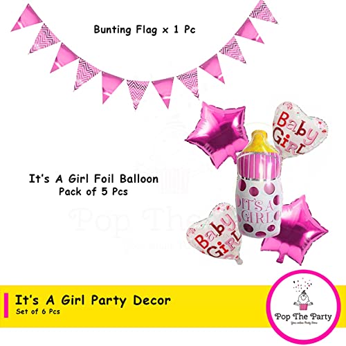 Pop The Party 6 pcs It's a Girl Bottle set, Pink Star, Baby Girl Balloon and Bunting Flag for Baby shower Decoration