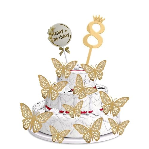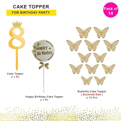 HomeBabyParty SuppliesPop The Party 8th Birthday Cake Decorations Gold Supplies Big Set With Black Happy Birthday Cake Topper, 12 Butterfly Cake Topper And Cake Topper (8 NUMBER)