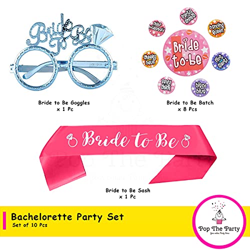 Pop the Party becheloratte Set (1 Pcs sash, 8 pcs Badge,1 Bride to be Goggles) (Blue)