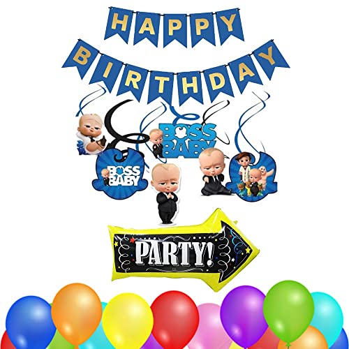 HomeBabyParty SuppliesPop The party Birthday Theme Decoration with Happy Birthday Banner, Latex Balloon ,Party Arrow Foil and Boss Baby Hanging Swirls Set of 44