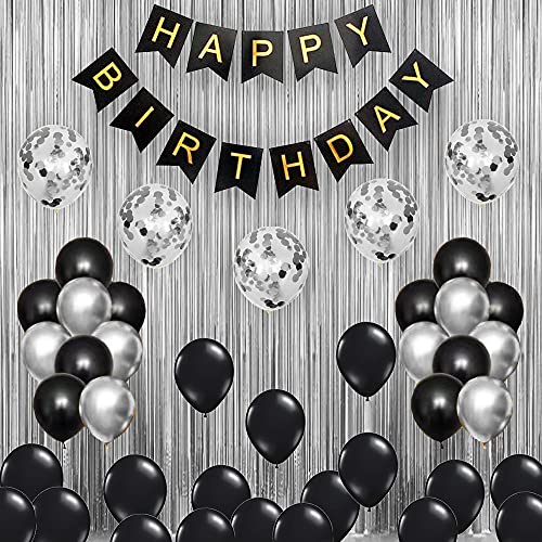 Black Birthday Party Decorations Set With Black Birthday Banner Silver Curtains Silver Confetti And Black Silver Latex Balloon Set Of 63 Pack For Birthday Supplies