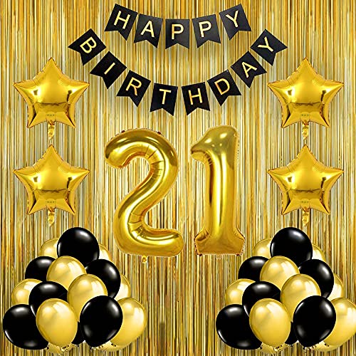 Black Gold 21St Birthday Party Decorations With Birthday Banner Star Foil Latex Balloons Curtains And 21 Digit No. Set Of 39
