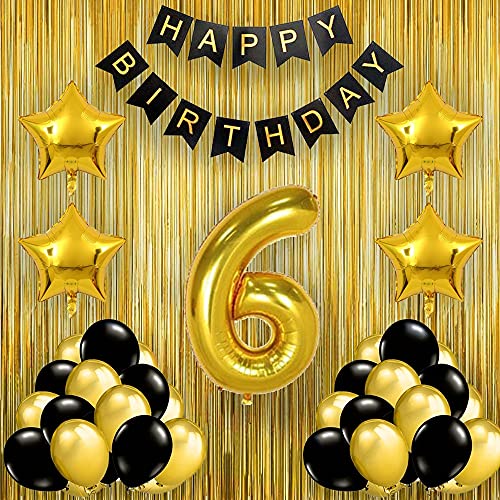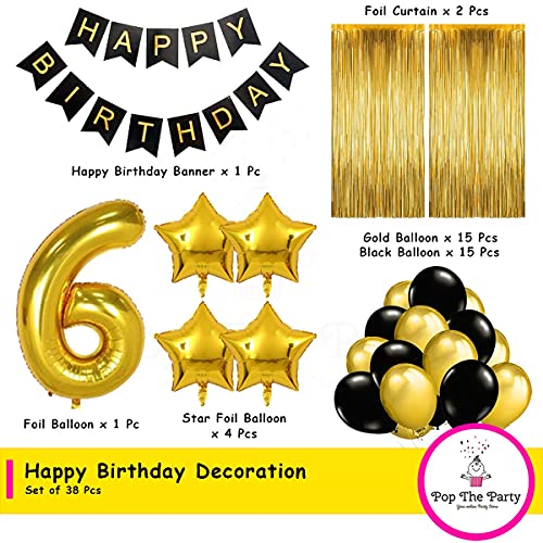 HomeBabyParty SuppliesPop The Party Black Gold 6th Birthday Party Decorations with Birthday Banner, Star, Latex Balloons, Curtains and 6 Digit No. Set of 39 Supplies (6thBirthday Party Decoration Gold)