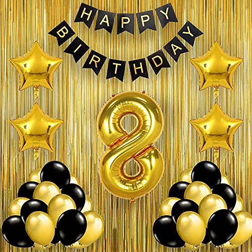 Black Gold 8Th Birthday Party Decorations With Birthday Banner Star Foil Latex Balloons Curtains And 8 Digit No. Set Of 39