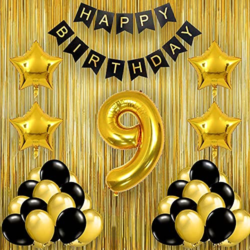 Black Gold 9Th Birthday Party Decorations With Birthday Banner Star Foil Latex Balloons Curtains And 9 Digit No. Set Of 39