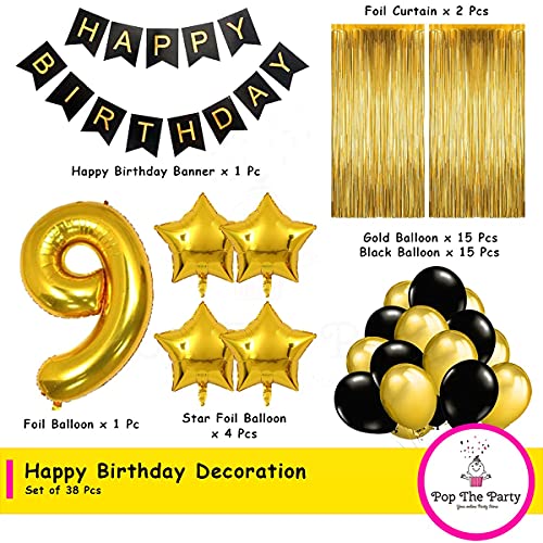 HomeBabyParty SuppliesPop The Party Black Gold 9th Birthday Party Decorations with Birthday Banner, Star, Latex Balloons, Curtains and 9 Digit No. Set of 39 Supplies