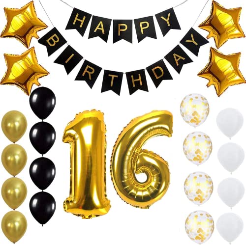 Pop The Party Gold 16th Birthday Decoration Kit With Banner ,Star Latex and confetti Balloon Set of 23