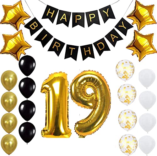 Pop The Party Gold 19th Birthday Decoration Kit With Banner ,Star Latex and confetti Balloon Set of 22