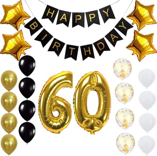 Package List: 1 X Happy Birthday 4X Star Foil Balloon 4Gold Latex4Black Latex 4White Latex 4 Gold Confetti Balloon 1X Digit Foil Balloon