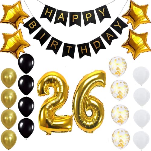 Pop The Party Gold 26th Birthday Decoration Kit With Banner ,Star Latex and confetti Balloon Set of 23