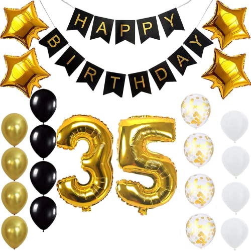 Pop The Party Gold 35th Birthday Decoration Kit With Banner ,Star Latex and confetti Balloon Set of 23