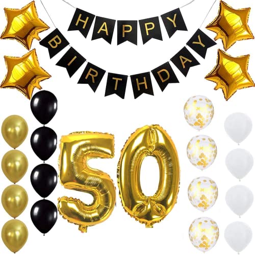 Pop The Party Gold 50th Birthday Decoration Kit With Banner ,Star Latex and confetti Balloon Set of 22