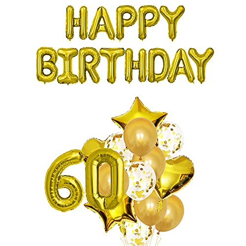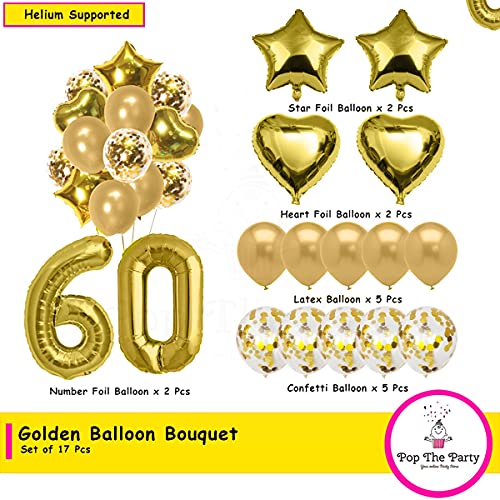 HomeBabyParty SuppliesPop The Party Gold 60th Birthday party Decorations With ,Happy Birthday Foil, Star Foil, Confetti and Latex Balloons , Heart Foil and 60 No. Foil Pack Of 17