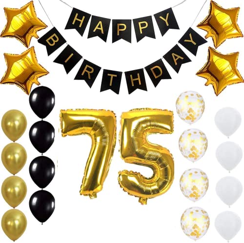 Pop The Party Gold 75th Birthday Decoration Kit With Banner ,Star Latex and confetti Balloon Set of 23